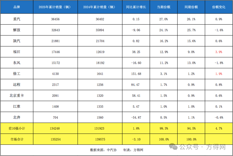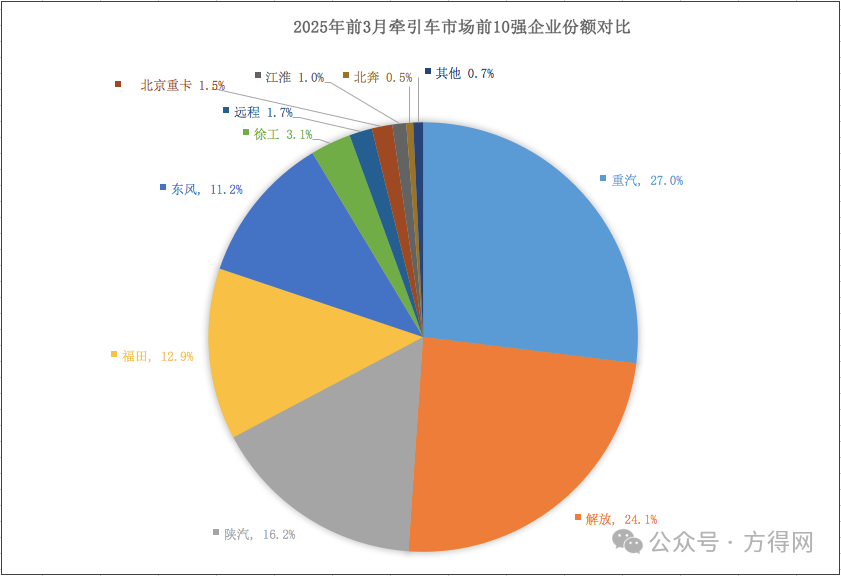 从累计销量来看,行业双寡头格局也非常明显,重汽与解放的累计份额均超过或接近1/4。数据显示,1-3月,重汽、解放的牵引车累计销量均超3万辆,分别为3.6万辆、3.3万辆,两者差距3813辆;两家企业市场份额分别高达27%、24.1%,两者份额之和高达51.1%,以两家之力占据整体市场份额过半,双寡头格局稳固。