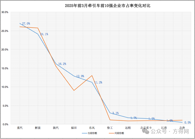 从整体市场来看,3月,前十强及前五强合计份额均上升,市场集中度再度增强。数据显示,3月,前10强企业牵引车合计销量5.6万辆,市场份额合计99.1%,较去年同期份额扩大5个百分点,留给前10强以外企业的市场份额不到1%。其贡献主要来自第一梯队,前5强合计份额高达92.1%,较去年同期份额(89.1%)扩大3个百分点,强者愈强。