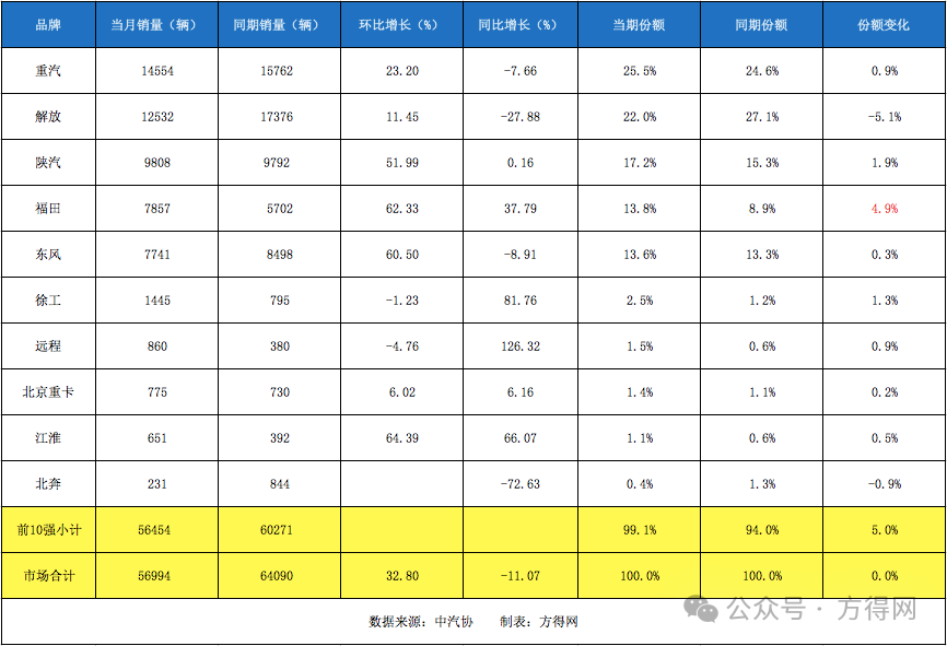 在整体市场表现一般情况下,3月,多数前十强企业表现尚可,过半以上企业实现同环比正增长,特别是在市场同比下滑态势中保持正增长。数据显示,3月,陕汽、福田、徐工、远程、北京重卡、江淮,这6家前十强企业均实现逆势同比正增长。其中,远程在前十强中涨幅最高(126.3%),福田在前五强中涨幅第一(37.8%)。