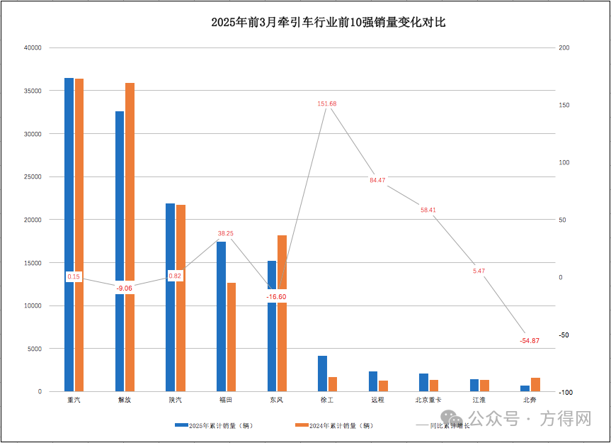 在行业整体下滑态势中,一季度,过半前十强企业实现逆势正增长,跑赢大盘。数据显示,1-3月,重汽、陕汽、福田、徐工、远程、北京重卡、江淮,这七家前十强企业牵引车累计销量实现同比正增长。其中,徐工在前十强中涨幅最高(151.7%),福田在前五强中涨幅最高(38.3%)。